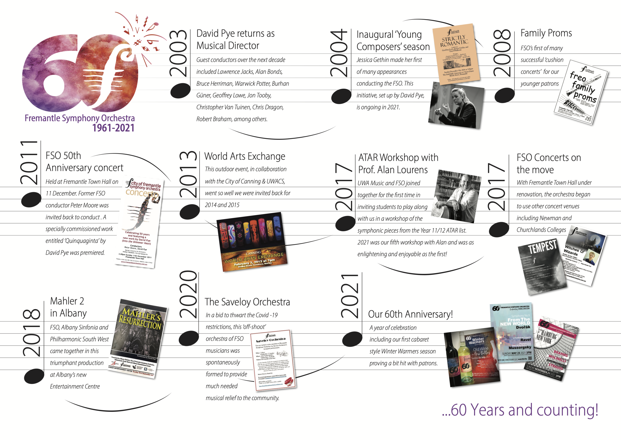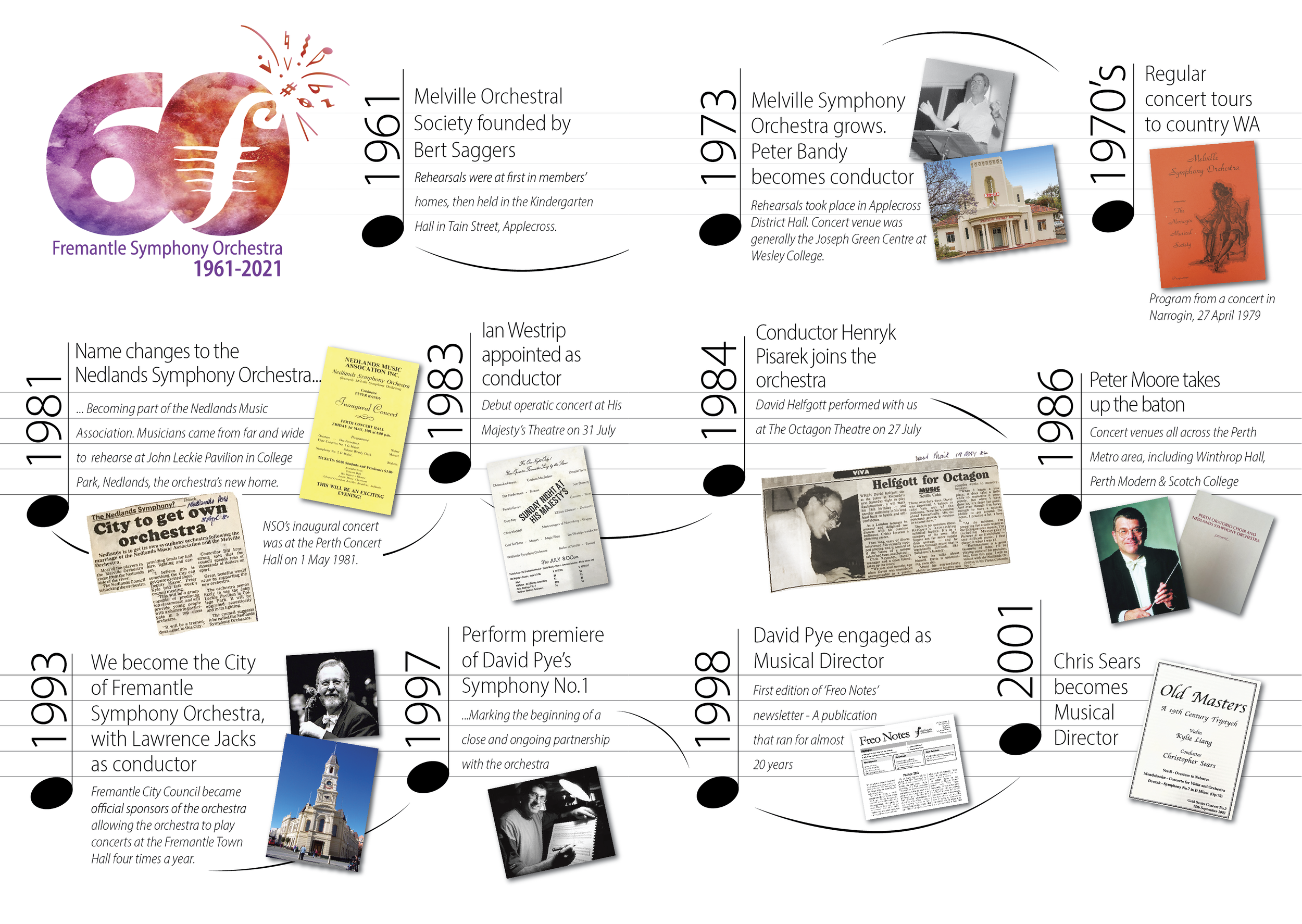 “As Music Director and Conductor for ten years of a previous incarnation, the Melville Symphony Orchestra (1973 – 1982), it is a privilege to provide a foreword for the 60th anniversary celebrations of the Fremantle Symphony Orchestra. By the end of my tenure, it was satisfying to know that when I left, the orchestra had evolved into a secure, solid unit. We oversaw the transformation of Melville to the Nedlands Symphony Orchestra in 1981. Since then, it has become the Fremantle Symphony Orchestra. That it continues to grow, expand and flourish is wonderful, and I am positive David Pye must take much of the credit for the position in which it now finds itself.
